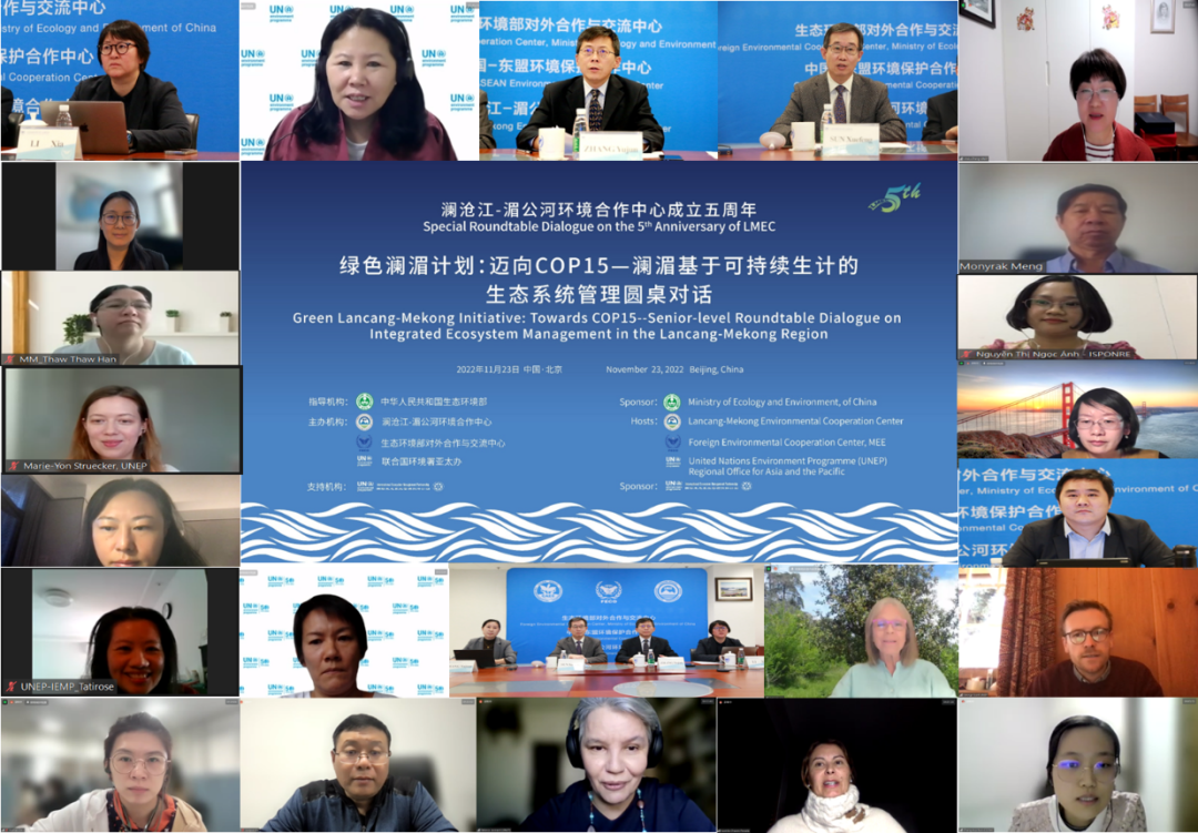 2022年11月23日,作为澜沧江-湄公河环境合作中心成立五周年系列活动之一,绿色澜湄计划:迈向COP15—澜湄基于可持续生计的生态系统管理圆桌对话以线上线下相结合方式在京顺利举办。本次活动由中国生态环境部指导,澜沧江-湄公河环境合作中心/生态环境部对外合作与交流中心(以下简称中心)和联合国环境署亚太办共同主办,联合国环境署国际生态系统管理伙伴计划支持。来自生态环境部及地方环境部门、湄公河国家自然资源与环境部门、联合国机构、国际组织、科研单位、企业等机构代表参加本次会议。中心主任张玉军、生态环境部国际合作司二级巡视员孙雪峰,联合国环境署亚太办主任德钦·次仁出席会议并致辞,联合国环境署驻华代表处项目规划主任王茜主持开幕式。