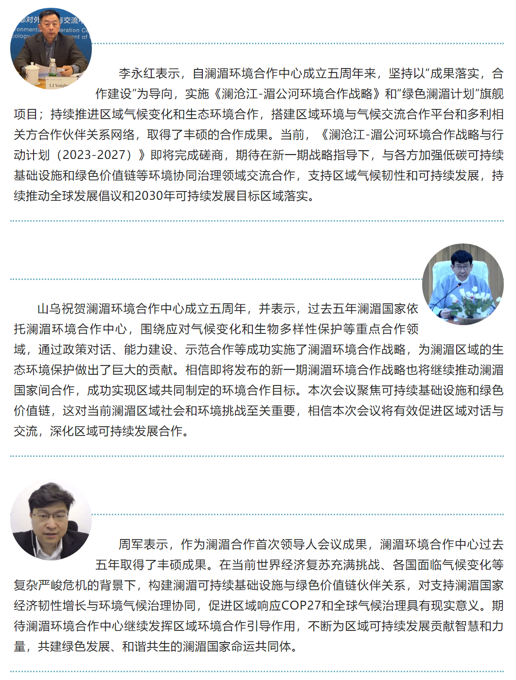 会上,与会代表对澜湄环境合作5年来取得的进展表示高度赞赏,一致希望持续提升澜湄环境合作网络建设,共同支持区域气候韧性基础设施投资和可持续价值链发展,助力区域实现联合国可持续发展目标和绿色经济复苏。