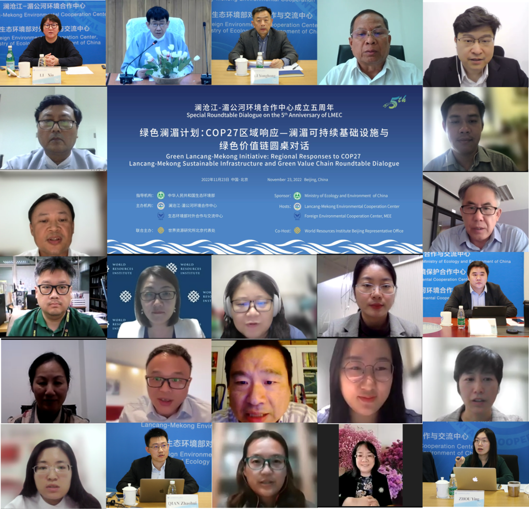 2022年11月23日,作为澜沧江-湄公河环境合作中心成立五周年活动之一,绿色澜湄计划:COP27区域响应-澜湄可持续基础设施与绿色价值链圆桌对话以线上线下结合形式在京召开。本次圆桌对话由生态环境部指导,澜沧江-湄公河环境合作中心/生态环境部对外合作与交流中心主办,世界资源研究所共同主办。来自生态环境部及地方生态环境部门、湄公河国家气候与环境部门、联合国驻华机构、相关国际组织及研究机构代表参加了会议。